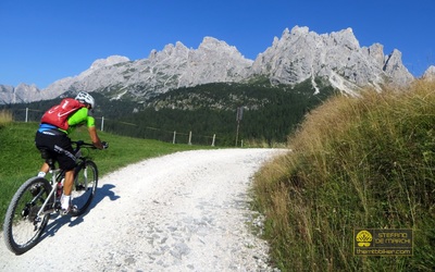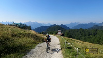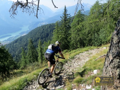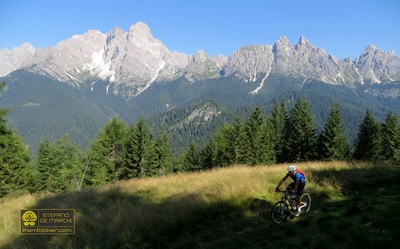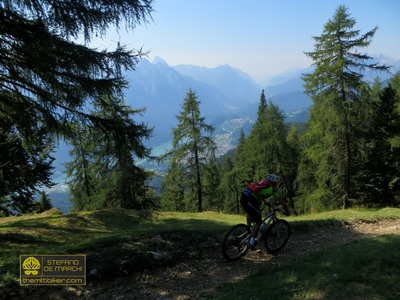 Per arrivare fin qui è però necessario affrontare una lunga e monotona ascesa, interamente su asfalto e dalle pendenze decisamente abbordabili, la cui conquista verrà ampiamente ripagata dai single track che caratterizzeranno la successiva discesa verso il Centro Cadore. L’avvicinamento alla salita avviene sui sentieri del Col di Medol e della Traversata di Centro Cadore, finchè a Lozzo inizia la scalata che si manterrà asfaltata, tortuosa e immersa nel bosco per quasi tutto il suo sviluppo fino allo scollinamento ai piedi del monte Ciastelin, il picco più orientale delle Marmarole. La vista, già qui maestosa, diventa ancor più ampia dal vicino rifugio Baion – raggiunto con qualche facile chilometro di strada forestale – dal quale si possono ammirare il monte Antelao e tutta la parete sud delle Marmarole. Il tour affronta quindi un primo tratto tecnico nella discesa verso Forcella Bassa, inerpicandosi poi fino alla panoramica radura del monte Brente. Si affronta ora la discesa finale, all’inizio sullo spettacolare trail della Cresta di Po Croda e poi su una ripida mulattiera verso Grea; gli adrenalinici single track di Rizzios sono il teatro della parte conclusiva della picchiata, che termina alle porte di Calalzo. Da qui l’itinerario rientra verso Domegge lungo piacevoli sterrati a fianco del lago di Centro Cadore. Punto di partenza: Domegge di Cadore, piazza dei Martiri. |